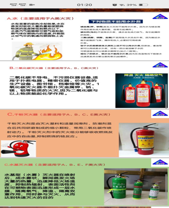 消防知識則從了解燃燒的基本條件,到滅火的幾種方法:冷卻法、隔離法、窒息法、抑制法,滅火器材的使用,放置地點,詳細的講述了應(yīng)對火災(zāi)的“四會”:會報警、會使用消防器材、會組織人員疏散逃生、會撲救初期火災(zāi)。四懂:懂本崗位的火災(zāi)危險性、懂預(yù)防火災(zāi)的措施、懂滅火方法、懂逃生方法。