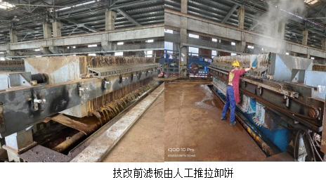 2022年3月威遠(yuǎn)藍(lán)鼎正式接手成渝釩鈦科技欣興釩廠(chǎng)新區(qū)水處理整套水處理系統(tǒng)。運(yùn)行至今,反應(yīng)釜壓濾機(jī)平臺(tái)在用的6臺(tái)壓濾機(jī)自動(dòng)卸餅功能全部損壞,每臺(tái)壓濾機(jī)87塊濾板,平均每臺(tái)卸餅在1.5小時(shí),每班人工依次卸餅一次,最高頻次兩次,人工勞動(dòng)強(qiáng)度大,工作效率低。高產(chǎn)期間無(wú)法滿(mǎn)足濾水要求,同時(shí)因?yàn)榄h(huán)境和勞動(dòng)強(qiáng)度致使員工離職率高。
